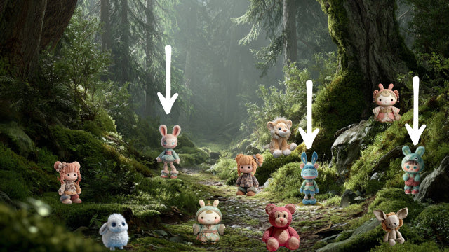 Show the first image on screen — a colorful scene filled with dolls, plushies, and random objects. Hidden somewhere in the mix are three Labubu-style dolls (spooky-cute creatures with big eyes and mischievous smiles).